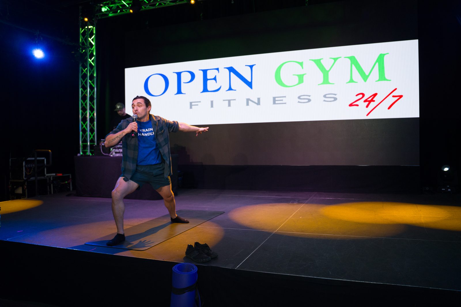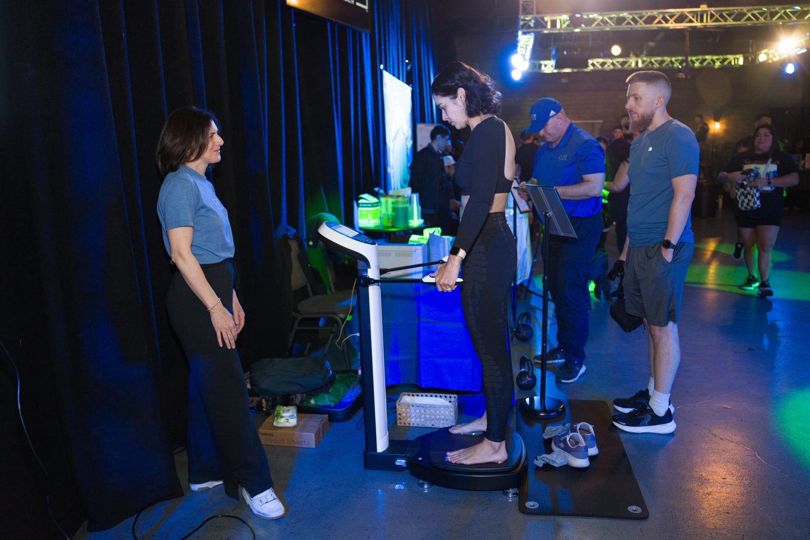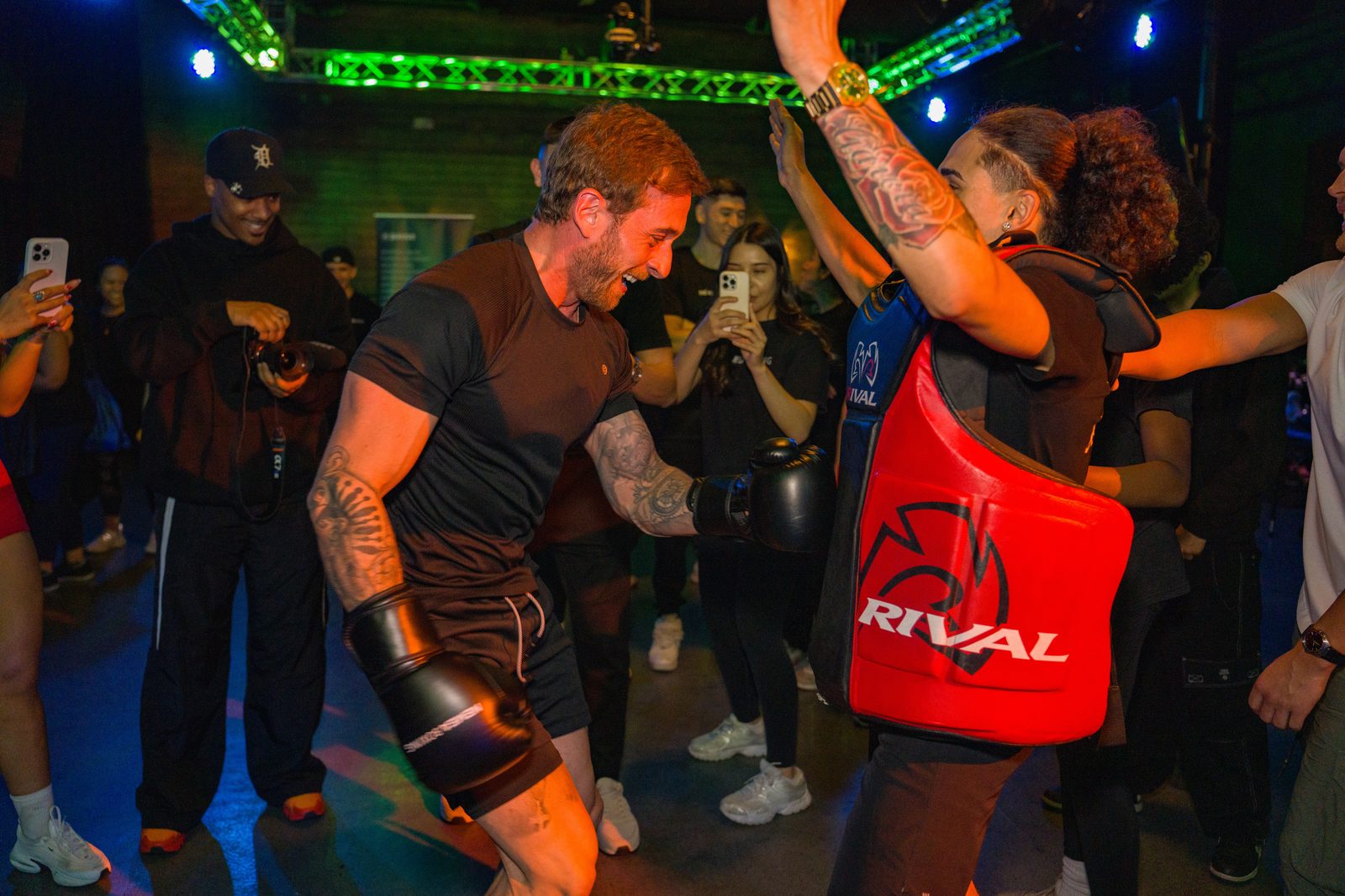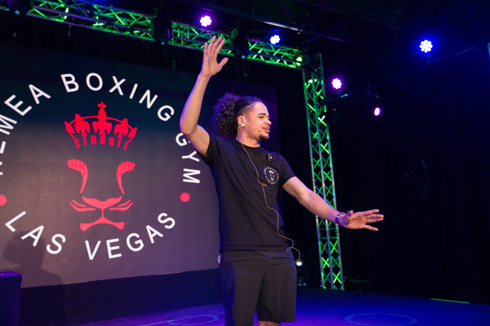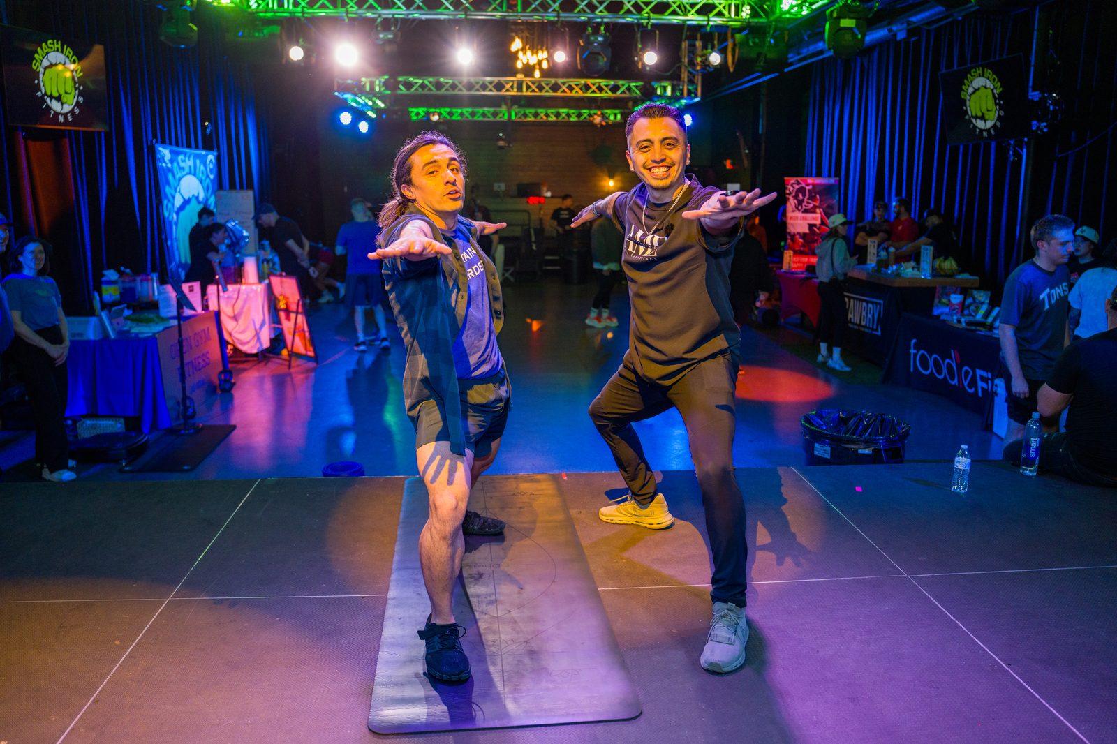 Boxing standoffs, strength challenges, and athlete showcases on the main stage.
